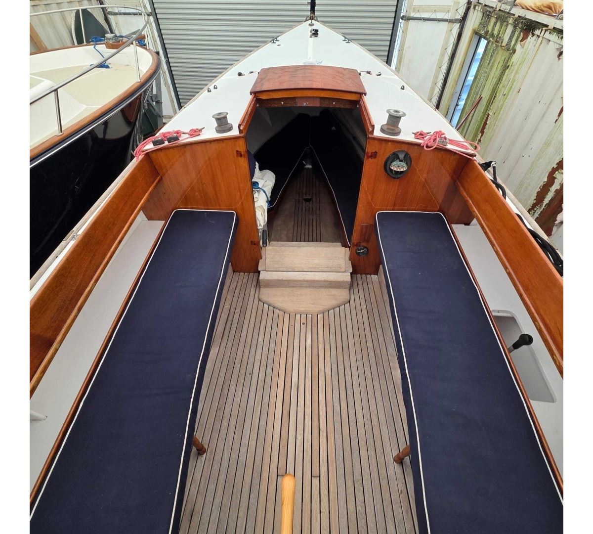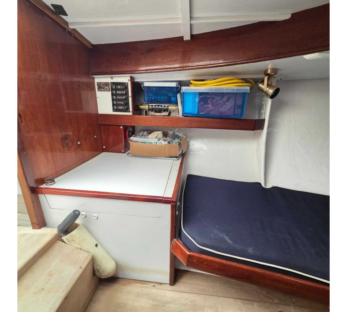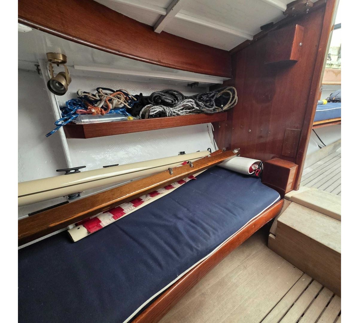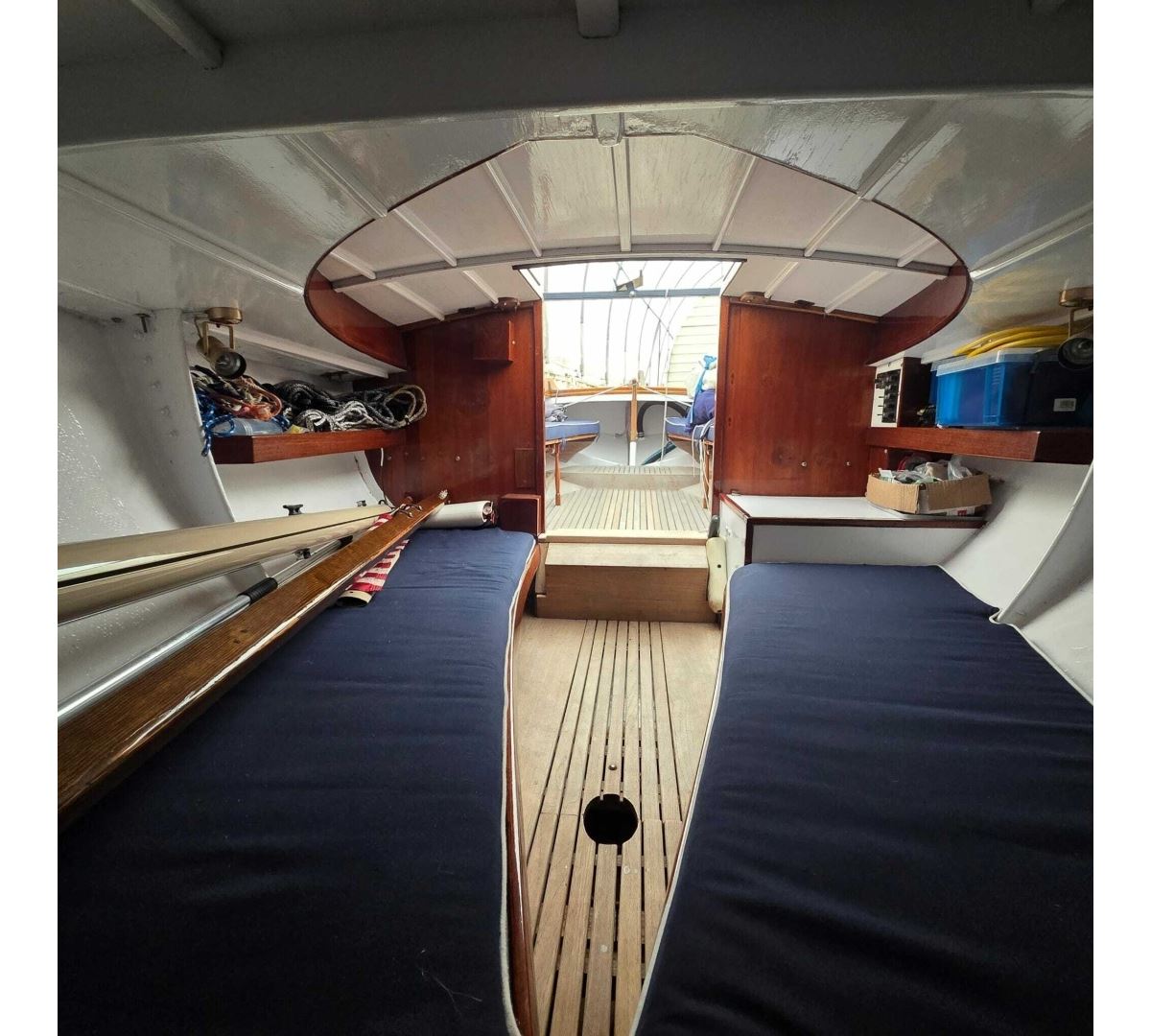 Her construction showcases quality throughout, with a hand-laid fiberglass hull and deck, rich Philippine mahogany trim, Bruynzeel mahogany plywood bulkheads, and teak accents in the cockpit and cabin sole.